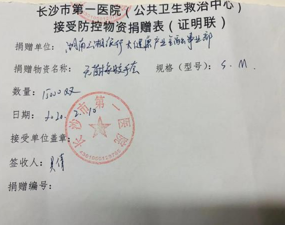 1月底,三湘银行大健康事业部了解到市一医院防护物资消耗巨大后,快速响应,立即行动,千方百计联系多方渠道采购防疫物资。2月10日,第一批防疫物资顺利运抵长沙,三湘银行第一时间将包括15000双医用手套在内的防疫物资,捐赠给市一医院,确保战斗在一线的医护工作者得到有效防护。